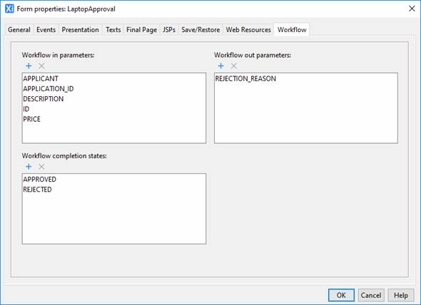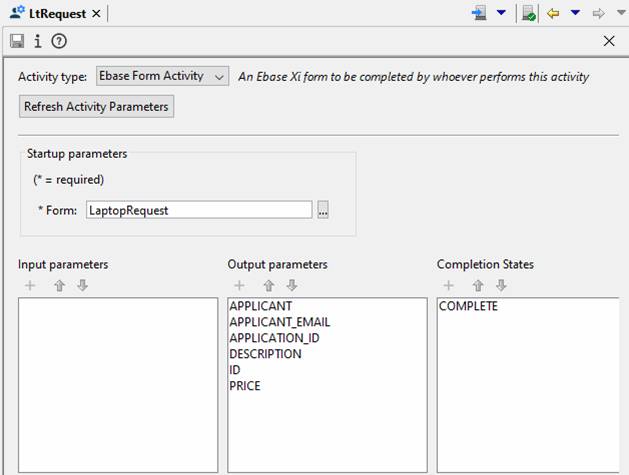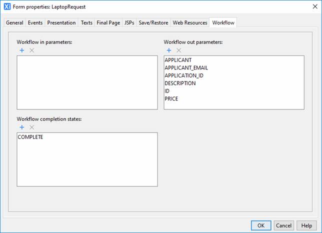 the LAPTOP_REQUEST and LAPTOP_APPROVE forms including input and output parameters, and defined Completion States |