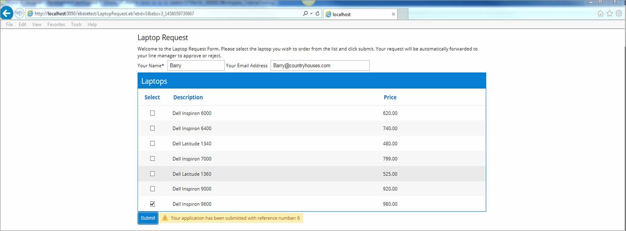 Enter a value for name and email address, choose a laptop and click Submit. The form starts a job for the LaptopWF process passing in the relevant data.