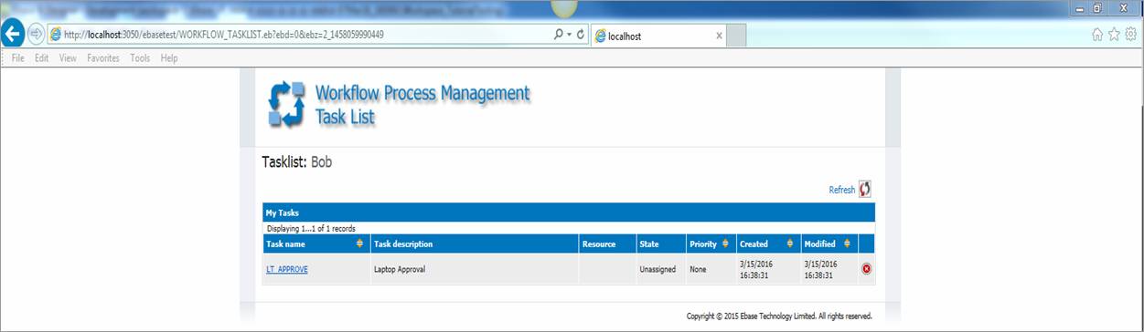 The task is waiting for a user with the MANAGER role to complete it. Clicking the Task Name in the list will automatically invoke the LaptopApproval form, passing in the data describing the Laptop requested.