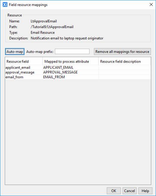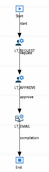 the Laptop process; LT_REQUEST, LT_APPROVE and LT_EMAIL Activities and LT_APPROVAL_NOTIFICATION Email Resource |