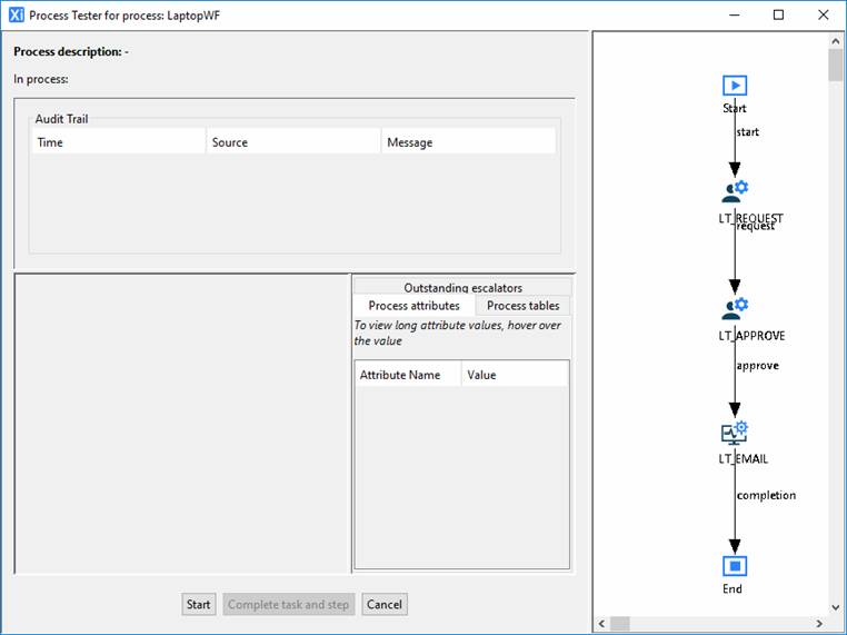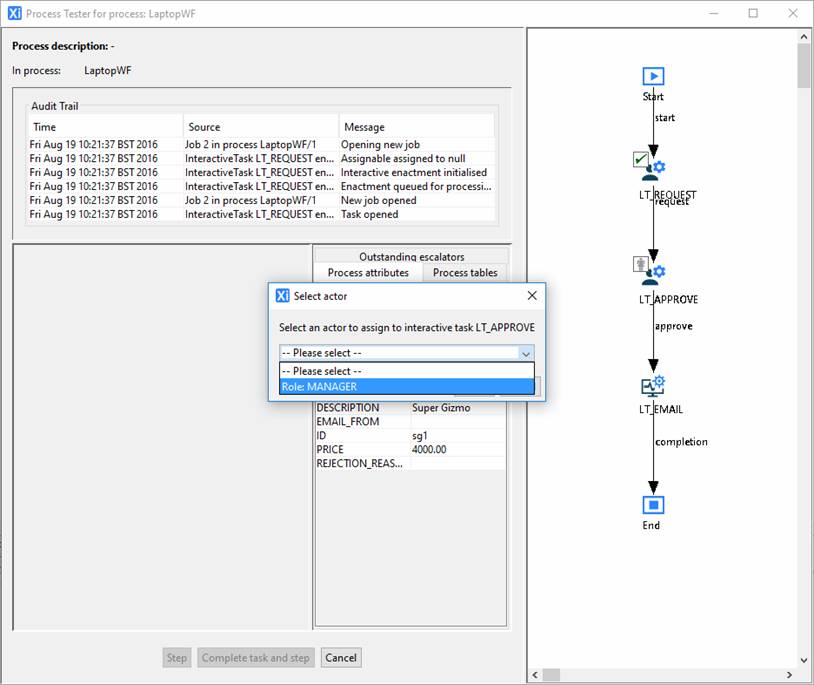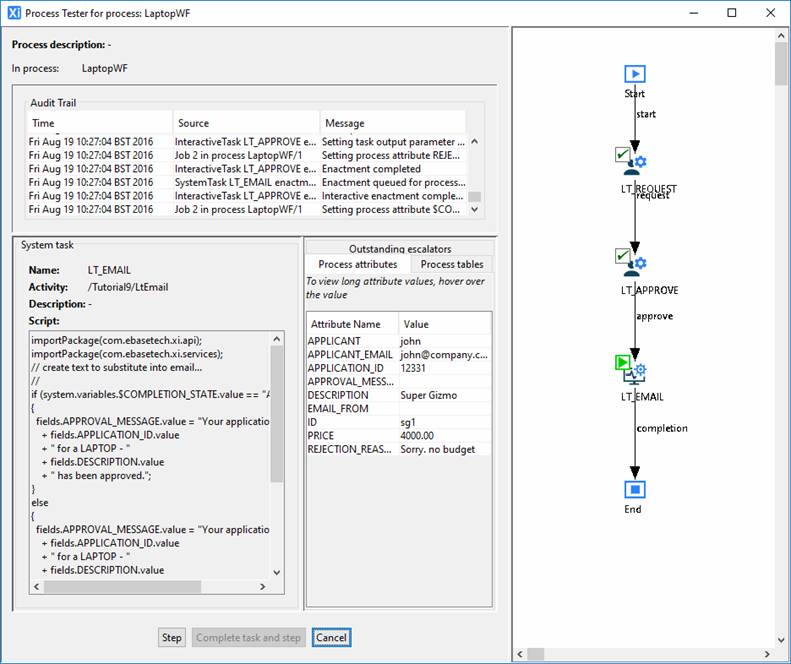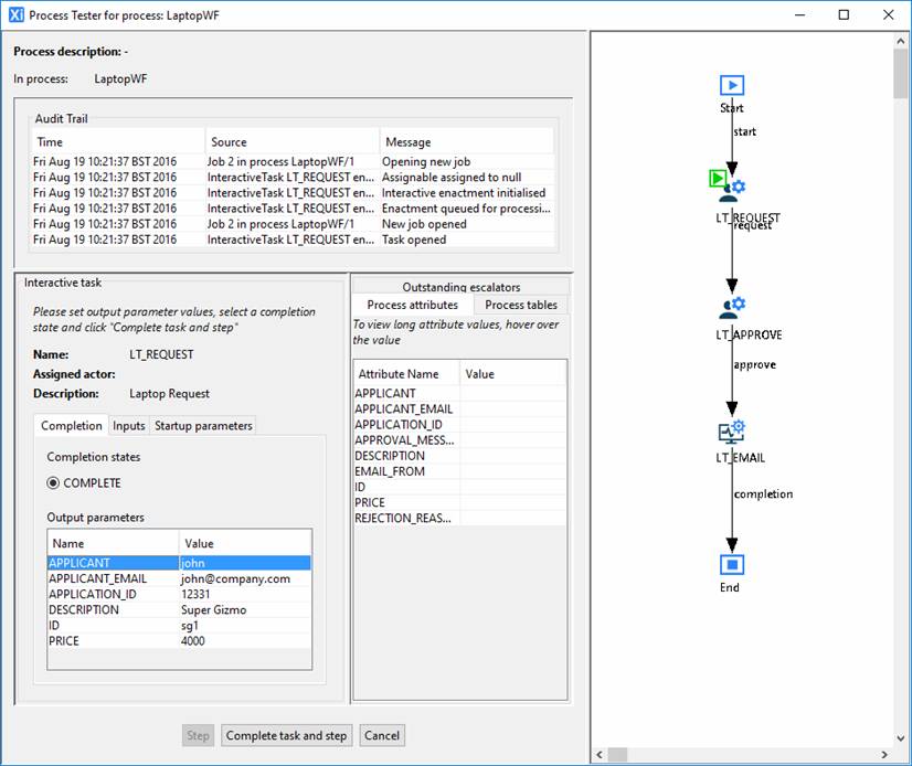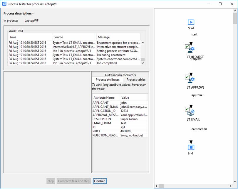 Note: The Process Tester actually executes the process for real i.e. it is not a simulation. As a result of executing the test an email will be despatched to the email address entered