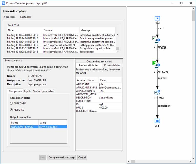 The panel for the second Task, LT_APPROVE, will appear. Choose a Completion State of REJECT and enter a Rejection reason as ‘Sorry, no budget’.