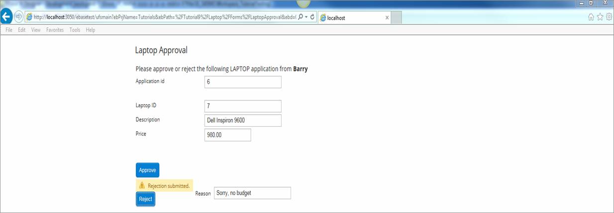 Bob must now decide whether to approve or reject the request. Enter a rejection reason of ‘Sorry, no budget.’ and click the Reject button.