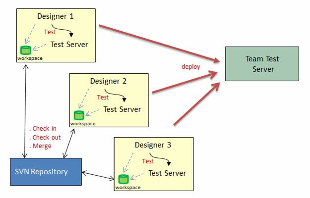 In V4.0, all developers within a team signed on to a single server and all work was saved in the repository database attached to the server. This has completely changed in V5.0: each developer works on their own personal system consisting of a designer and a local test server; it is recommended that synchronization with other team members is done using a version control system e.g. SVN or CVS. All aspects of designer security have been removed including the ability to specify which entities are visible and editable to each designer; designers now have full access to all the files in their workspace. If necessary a development team test server can be set up to act as a single consolidation point.