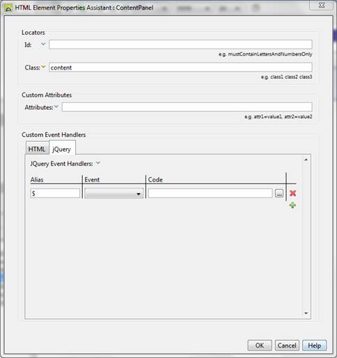 We do this in the ContentPanel panel’s HTML Element Properties Assistant. There is a choice of two Locators: Id and Class.
