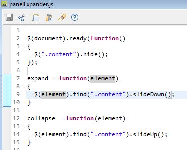 Thus in the expand function, once it has found the content panel, calling slideDown() on it will expand it.