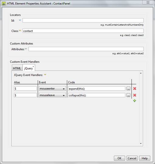We used this feature when we created the two Event Handlers in the contact panel’s Html Element Properties Assistant above. The Event Handlers listen for mouseenter and mouseleave events on the contact panel’s div element