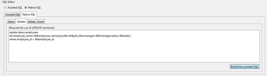 · Native: the SQL for fetch, update, insert and delete operations is supplied explicitly. The system substitutes values into this supplied SQL. Click here for more details.