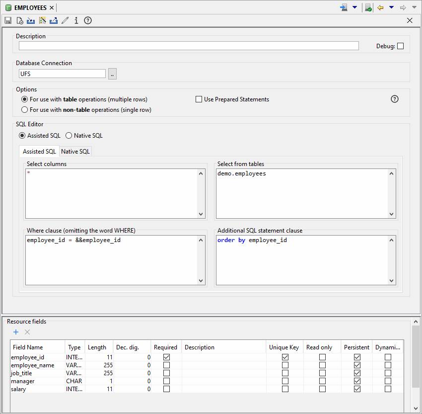 · Assisted: the SQL is constructed from four fields in the Database Resource: Select columns, Select from tables, Where clause, Additional SQL statement clauses. From these, the system builds the appropriate SQL statements to be used for fetch, update, insert and delete operations. Click here for more details on the SQL generated.