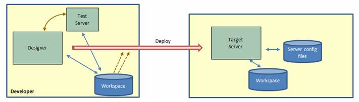 Deployment is intended to be used to move applications between related systems e.g. Development -> Test, Test -> Production etc. The deployment process is initiated from an Ebase Xi Designer and this contacts the target server and transfers all the files.