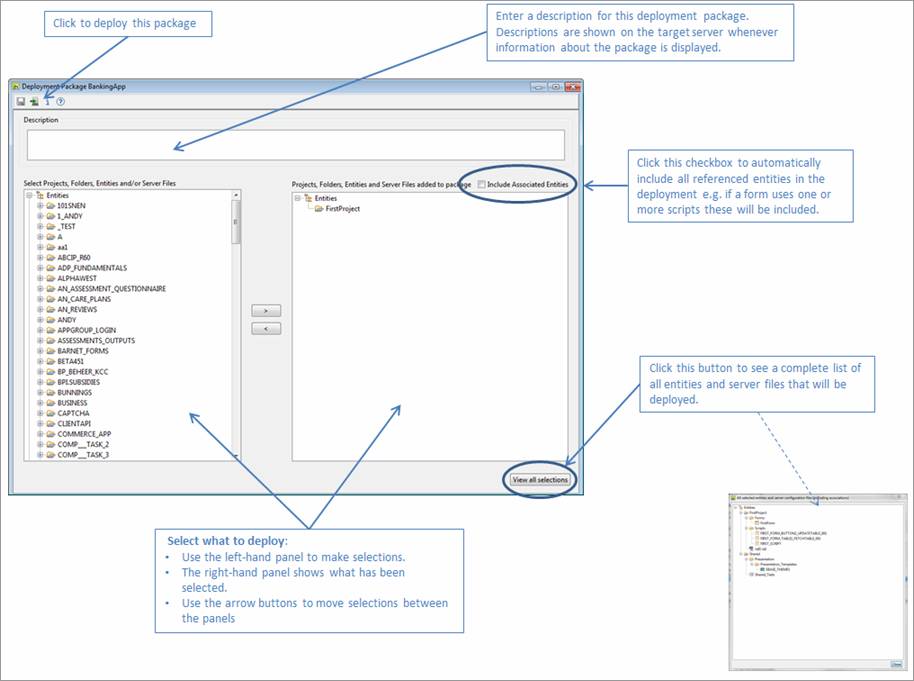 This shows which entities and/or configuration files are to be deployed. Make selections using the left-hand panel, the right-hand panel shows what is selected, use the arrow buttons to move items between the panels. When folders or projects are selected, all entities contained in these folders/projects are deployed - the list of files is not fixed, it is re-evaluated each time the package is deployed