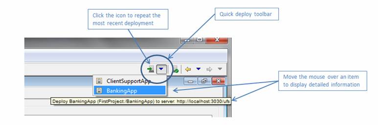 When a package is deployed to a specific server, it is also added to the quick deploy toolbar – this is towards the top of the designer window on the right-hand side. The most recent deployment can be re-executed by clicking on the icon, or you can select from a list of the most recent deployments.