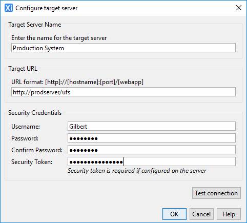 User name and password on the target server. See Deployment Security Requirements below. Security Token is required when server deployment property Deployment Security Token is specified, and must then match the server token value. |