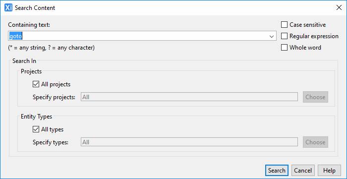 Containing text: enter the text to be searched for. You can also enter an * to represent any group of characters or a ? to represent any single character. Previous searches can be selected from the dropdown list.
