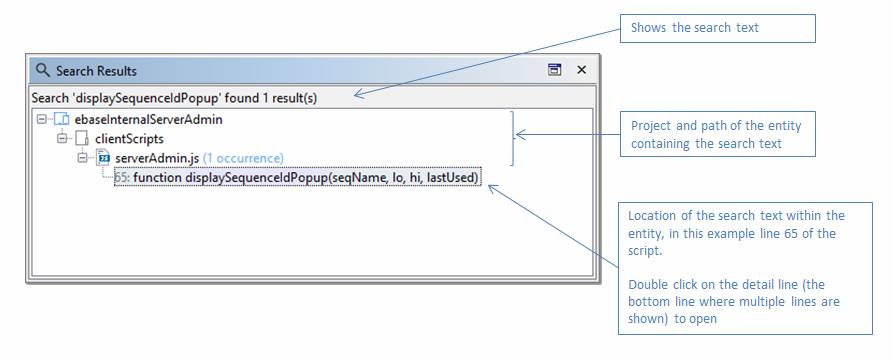This panel contains the results of a search. By default it is located at the bottom left of the designer but can be relocated to another location by dragging the title bar.