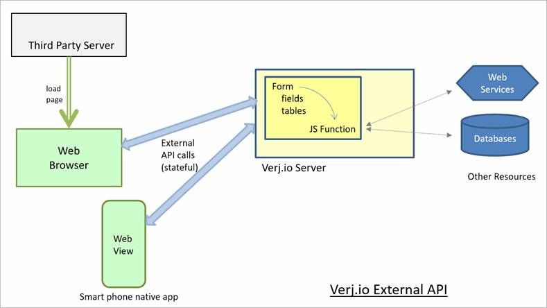 The External API is a client Javascript API that provides access to the Verj.io server from a web page served from another server or from a native phone app using the phones Web View. The main feature of the API is that it provides stateful access to the server i.e. multiple requests can be made to the server within a session; this distinguishes it from a Restful web service published on the Verj.ioi server which provides stateless access.
