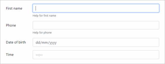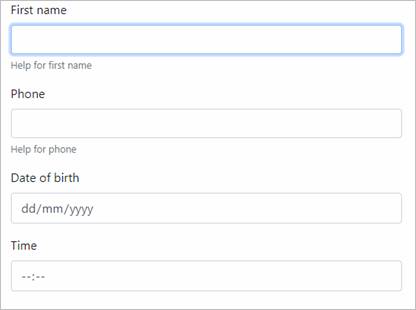 Note that the Calendar and Value Pattern field parts are not shown when using Bootstrap. Instead it is recommended to use the HTML 5 input types Date, Time and Datetime-local; these provide localized input formatting. These input types are specified using field property Display Type.