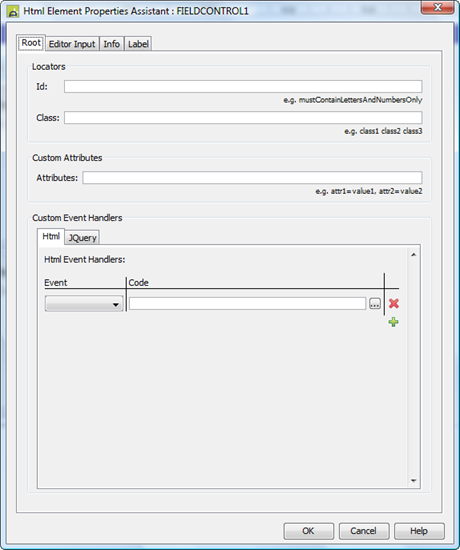 In addition to its Root Element, Html Element Properties can be configured for its Editor, Label and Info. If the Field Control is in a Repeater Control the Id Html Element Property is disabled for every element in the Control.