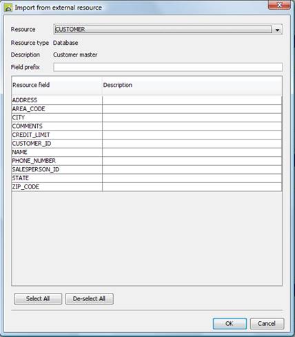 Select the resource from the dropdown at the top of the window - this contains all the resources in the form’s Resources View excluding those resources which can only be used with tables. Then select all the required fields and click OK. You can use the select all and de-select all buttons. You can also select a range of fields by holding down the SHIFT key, or select multiple fields using the CTRL key.