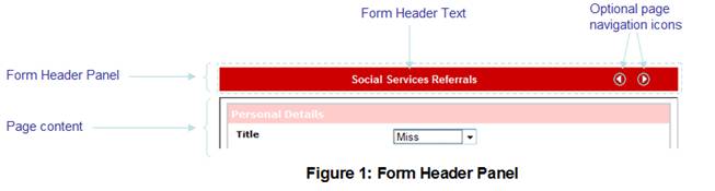 The Form Header Panel is an optional panel which can be included at the top of every page. It displays the form header text and optionally a set of small page navigation icons: