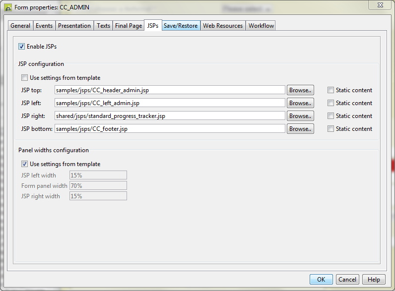 This tab allows you to specify the paths of the optional surrounding JSPs. JSPs specified here override any default values configured for form default properties in the form’s presentation template, and can themselves be overridden by specifying values for the Page Control properties for individual pages. Click here for info on the precedence of the various JSP configuration parameters.