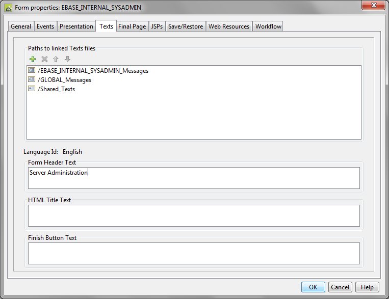 Both the local texts and these configured texts files consist of a number of individual texts which are identified by an id. At runtime the system searches for a text using its id, and searches first the local texts followed by all configured texts files in the order shown.