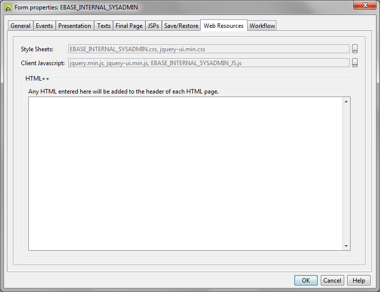 Configure client browser Javascript files to be used with all pages of a form. Displays the Client Javascript Configuration Dialog. Client browser Javascript files can be configured at three levels, where each level can inherit or disable Javascript files configured at higher levels: