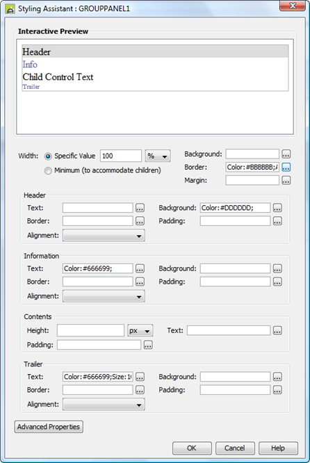 Sets the width to one of the following: · A specific value e.g. 300px · The minimum value: this results in the Group Panel Control being just as wide as it needs to be to accommodate its content Note that this setting will be ignored if the parent container layout specifies a horizontal cell alignment of fill (this applies to Horizontal Box, Vertical Box and Column layouts). This is equivalent to specifying 100% above. Warning: when a specific value is set, any margins will be in addition to the specified value and can cause the Group Panel Control to “break out” of its parent space. Click here for further info. See also: hints and tips, understanding width. |