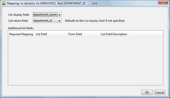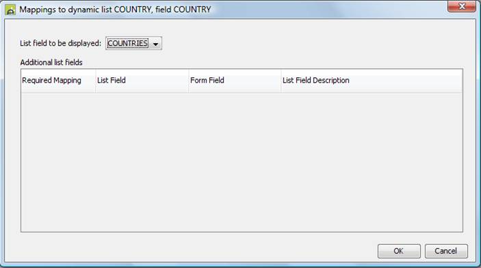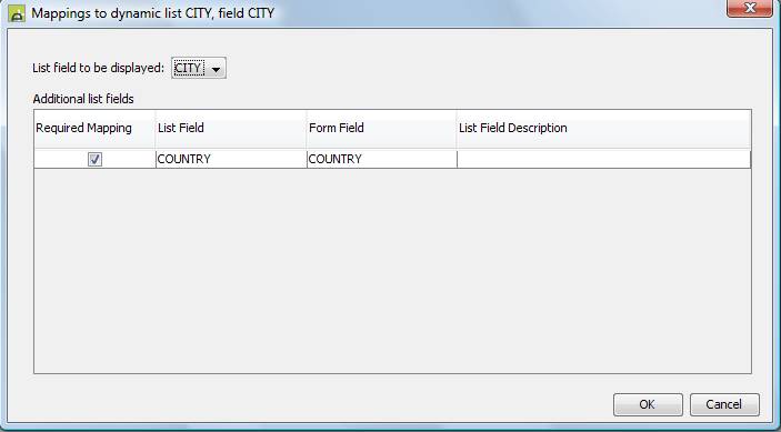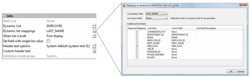 When a list is associated with a form field, the fields of the list are linked with the form fields via Dynamic List Mappings. These mappings support configuration of: