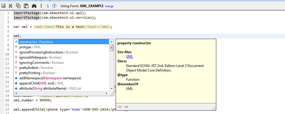 The code-assist in the Javascript editor supports the completions for the 5 main XML objects described above. Details for the full API can be found in the ECMA-357 document.