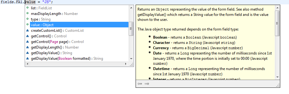 Code-assist can be used both for Javascript variables or functions, and for Java objects (this includes the Ebase API). It is extremely useful for showing lists of form fields, tables, controls etc and showing available methods and properties. However, bear in mind that Javascript is a language that supports dynamic types and it isn’t always possible to know accurately which type a variable or expression resolves to. For this reason, the methods and properties shown by the code-assist feature should not be interpreted as the limit of what is available. As a programmer, you may know that a certain variable is of a different type and therefore you can invoke any methods applicable for that type.