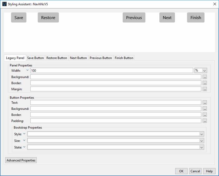 The following properties apply to the finish button and override the default properties for all buttons specified in the Legacy Panel section.