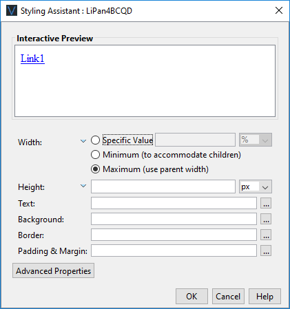 Sets the width to one of the following: · A specific value e.g. 300px · The minimum value: this results in the control being just as wide as it needs to be to accommodate its children. · The maximum value: the width is taken from the parent container control. This width will then include the control plus any configured padding, border or margins. Note that this setting will be ignored if the parent container layout specifies a horizontal cell alignment of fill (this applies to Horizontal Box, Vertical Box and Column layouts). This is equivalent to specifying maximum above. Warning: when a specific value is set, any padding, border or margins will be in addition to the specified value and can cause the control to “break out” of its parent space. In particular, try and avoid specifying a width of 100%; use maximum instead. See also: understanding width. |