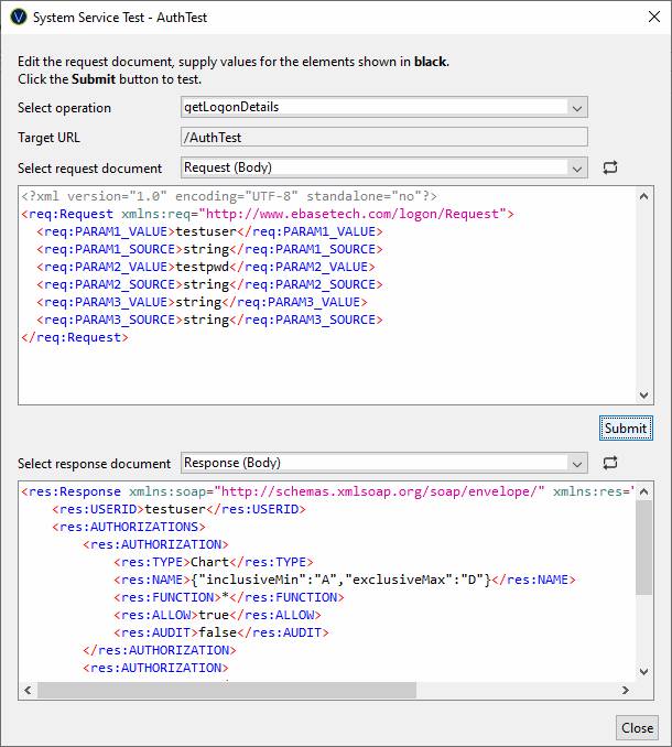 A Logon Service can be tested by clicking the test icon on the editor toolbar. The test dialog shown