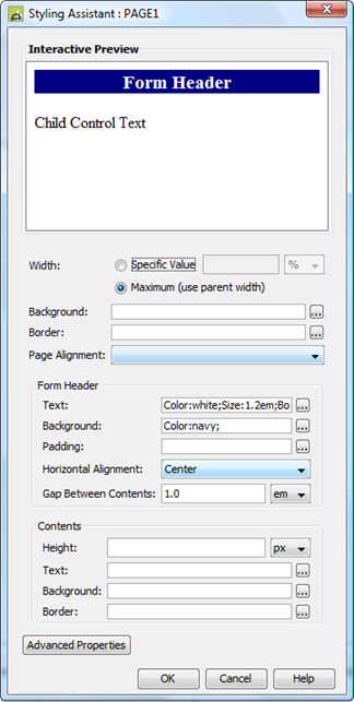 CSS class and inline style applied to the page content. Style configured here is applied to all child controls but excludes the Form Header panel and surrounding JSPs. |