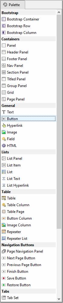 The Palette View contains a list of all available controls. A control can be dragged to either the WYSIWYG View or the Outline View. The Bootstrap section is only available when a form is configured to use bootstrap i.e. the framework property in Form Properties is configured to use bootstrap (by default this property is inherited from the Presentation Template).