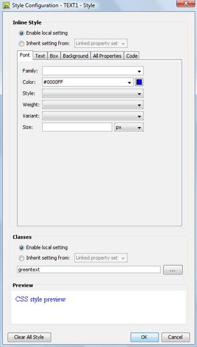 The Enable local setting and Inherit setting from radio buttons allow you to specify whether a property value is configured locally (in this dialog) or inherited from somewhere else – the dropdown list defines where the property is inherited from. See local/inherited control property values for more information. This local/inherited choice is made independently for class and style properties. Note that when this dialog is invoked from the presentation template editor (Property Set editor), these radio buttons are not shown.