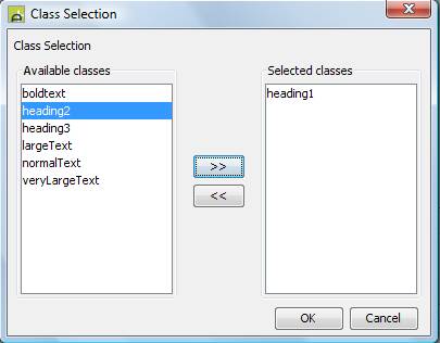 This section allows specification of CSS classes. To select classes, click Enable local setting, then enter class names in the editor box or click the .. button to display the Class Selection dialog: