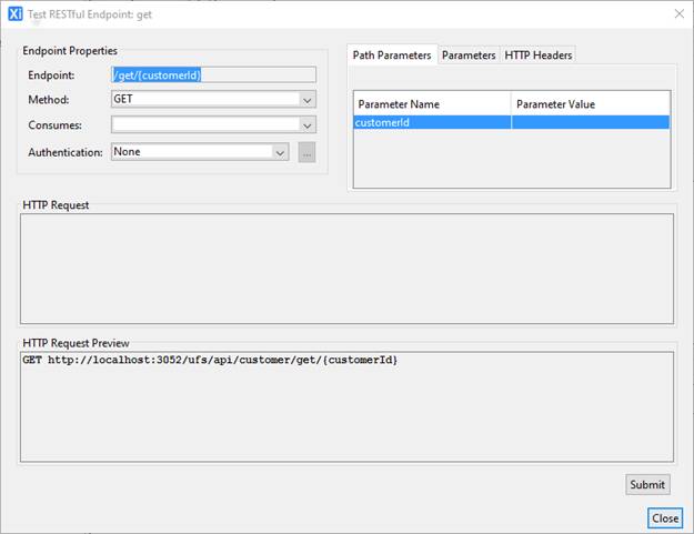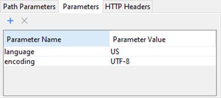 The Path Parameters table is automatically populated with the path parameters from the endpoint URI. The Parameter Value is the only column that is editable in the Path Parameters table. It is not possible to add additional path parameters.