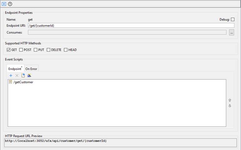 This is the URI for the endpoint and forms part of the URL used by callers – see above. Path parameters can be specified by enclosing the name of the parameter in between { }, e.g {customerId}. These parameters are accessed using the JavaScript API at runtime. A URI can consist of multiple parts and contain more than one parameter. The URI has to be unique. When parameters form part of the URI all parameter names are treated as representing the same value at design time e.g /users/{username} is the same as /users/{userId} |