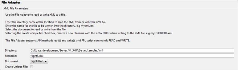 The XML document and the Flights table are the same as the previous example. The XML resource named FlightsXml contains an empty XML document flightsDoc and a file adapter as follows: