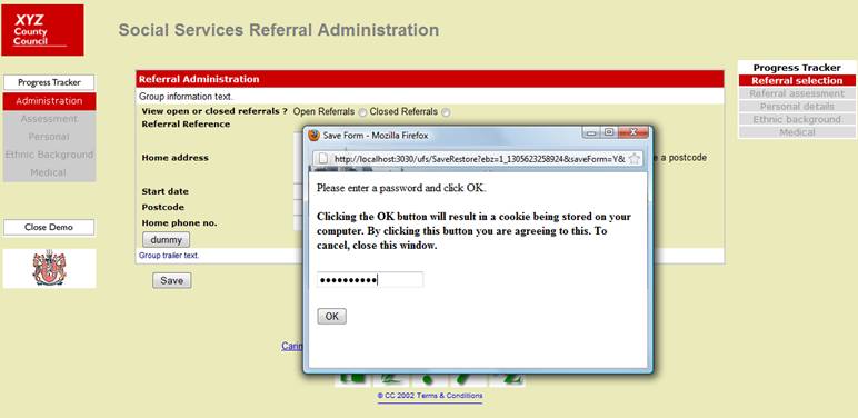 The save/restore function works by storing a cookie on the client machine containing the time and date and the form name. In European Union countries, it is illegal to store a cookie on a client system without first asking the user’s permission. To accommodate this, the following practice is recommended: