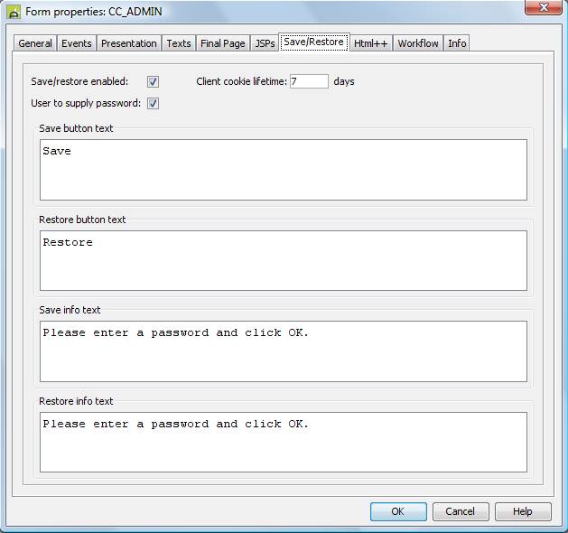 The save/restore feature is activated and its attributes configured using the save/restore tab of the form properties dialog box (See Form Properties for more information).