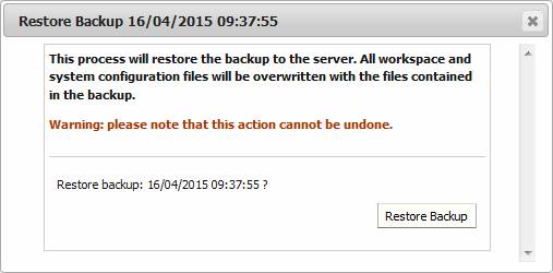 Click the Restore link in the Previous Backups table to restore from a backup. Note that this replaces the entire workspace and all server configuration files in the ebaseConf folder - there is no ability to restore individual files. The following popup confirmation panel is displayed: