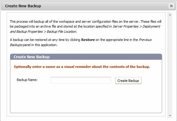 Optionally enter a backup name; this acts as a tag and is displayed in the Previous Backups table. Click the Create Backup button to create the backup. This may take some considerable time depending on the size of the workspace.