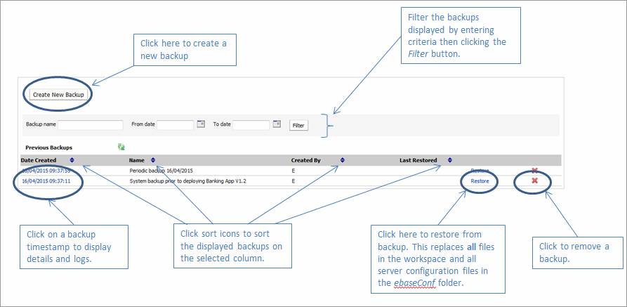 A backup represents a snapshot of the current state of all the applications that have been deployed to this server; it does not constitute a full system backup of the Tomcat system and does not contain all the Tomcat files. Typically you might create a backup just before deploying a major change and use this as an additional level of security on top of the ability to roll back individual deployments. Note that when a backup is restored the entire workspace and all server configuration files in the ebaseConf folder are replaced – there is no ability to restore individual files.