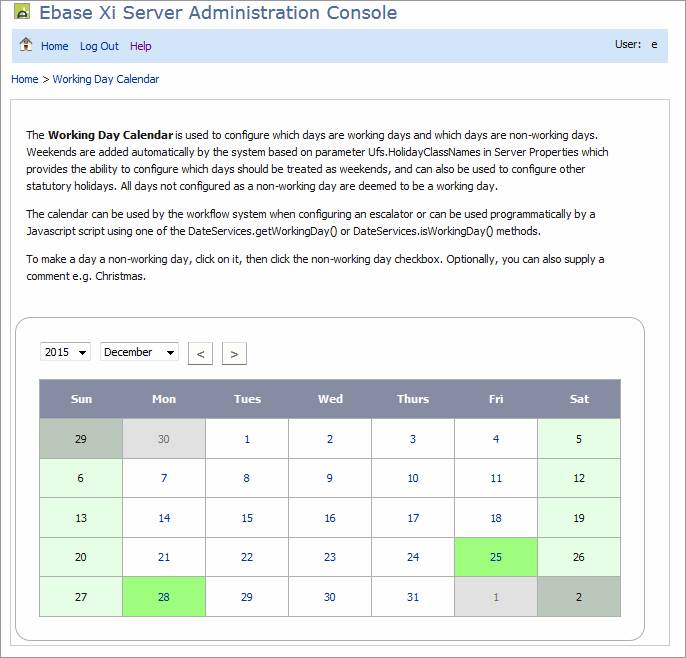 The Working Day Calendar allows you to configure which days are non-working days. All other days by inference are seen as working days. The calendar consists of a Java class which defines the basic non-working days – usually weekends – plus the ability to configure additional non-working days – usually public holidays – in addition to this.