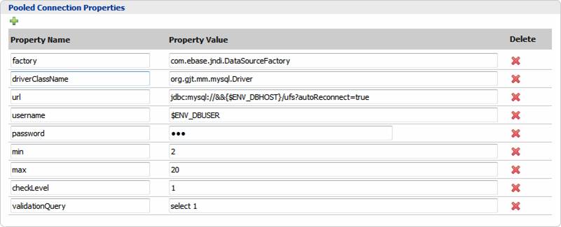 These properties are available when connection type Pooled connection is selected. Environment variables can be included within the property values as shown in the example below.