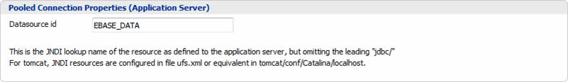 The JNDI lookup name of the resource as configured to the application server, but without the leading jdbc/. For example, if the JNDI lookup name is configured as jdbc/MYDB, this should be specified as MYDB. For the distributed Tomcat application server, resources are configured in the context definition file (as distributed, this is file ebase.xml in folder userdata/tomcat/conf/Catalina/localhost but this may change if the context is renamed or additional contexts are added).