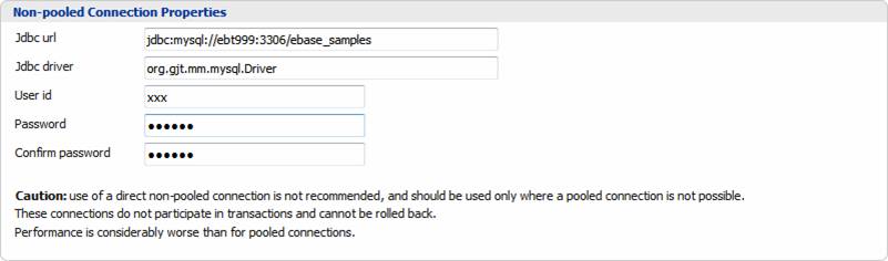 ·         Direct non-pooled connection: this option is not recommended. The system connects directly to the database without going through a connection pooling layer. These connections are non-transactional and considerably slower than pooled connections. This option should only be used where the database system does not have a JDBC driver that supports connection pools.